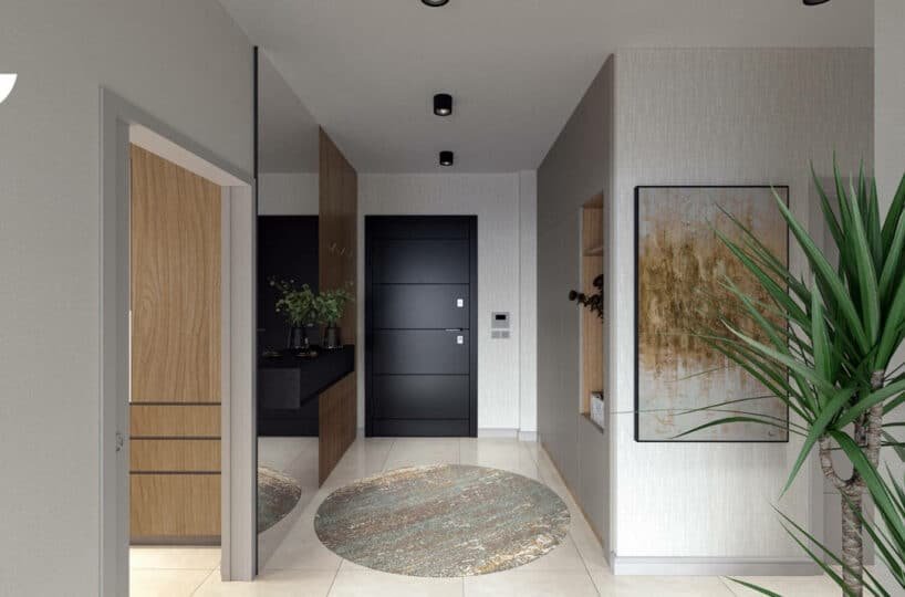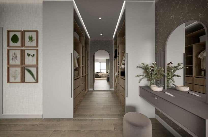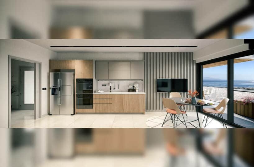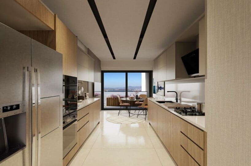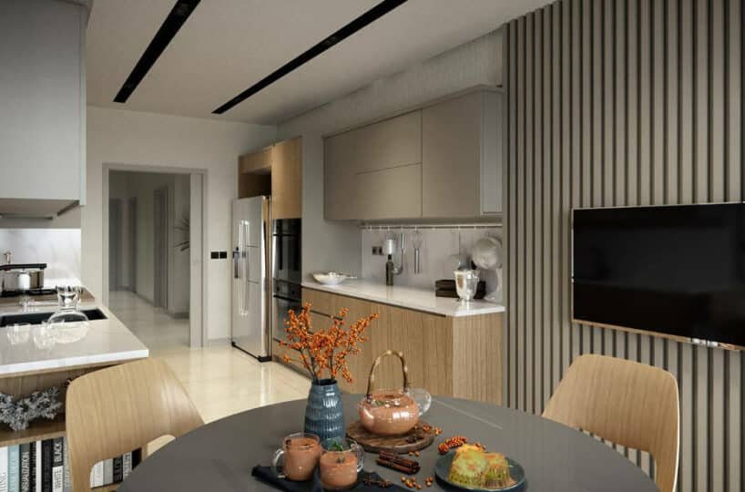 - آشپزخانه با طراحی خاص و ست توکار پنج تکه (ماشین ظرفشویی، فر، اجاق گاز، هود و مایکروفر)