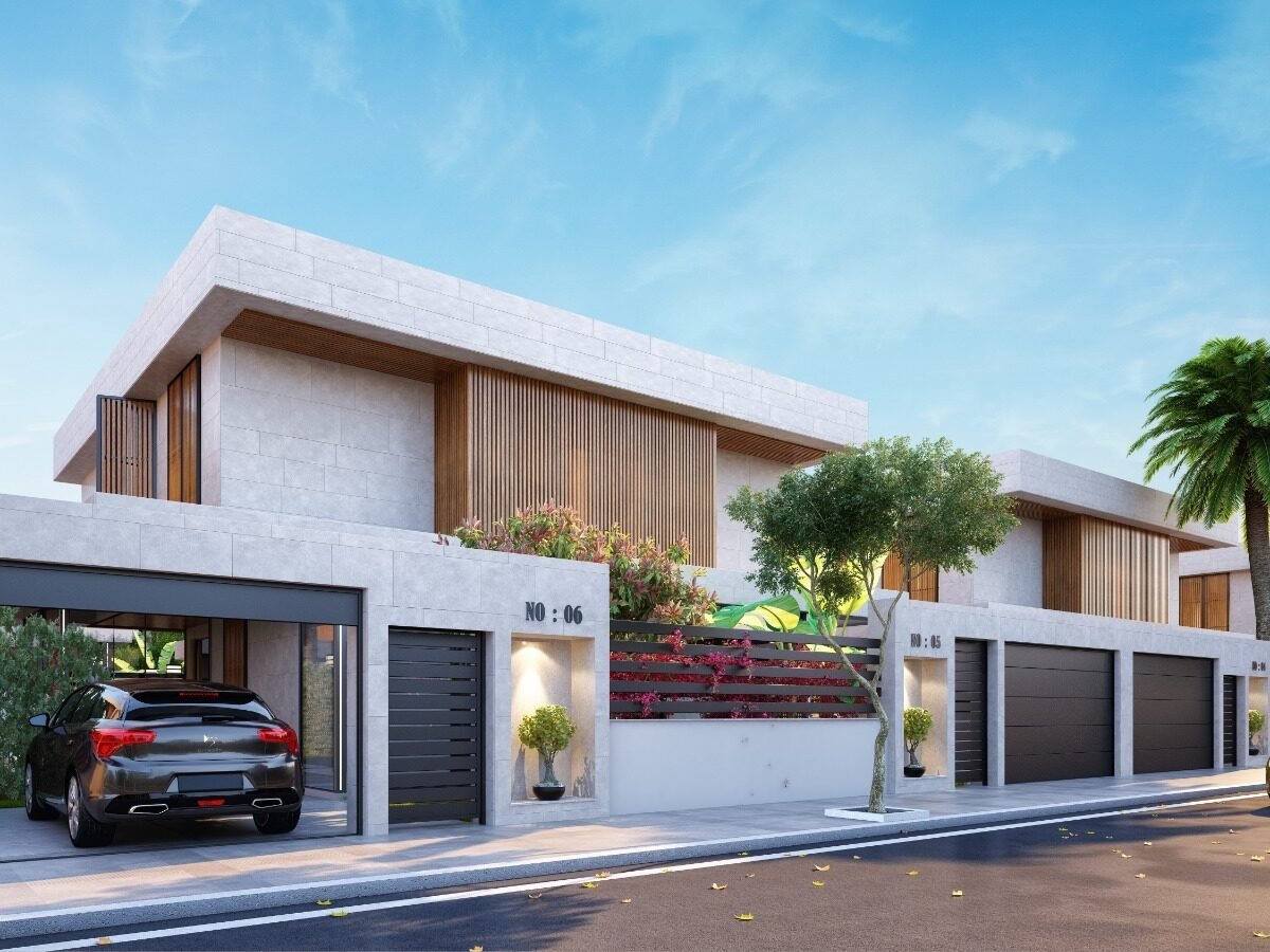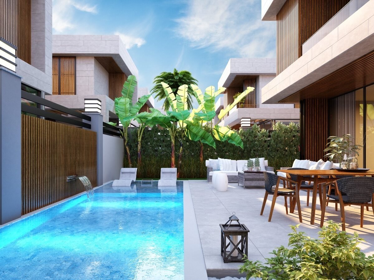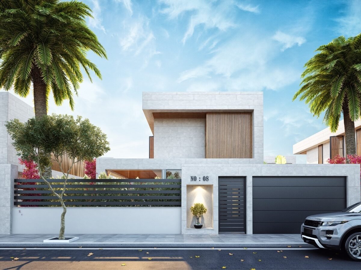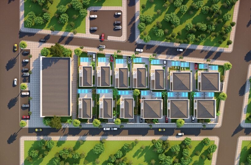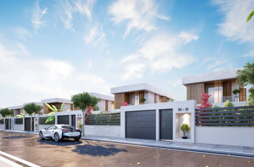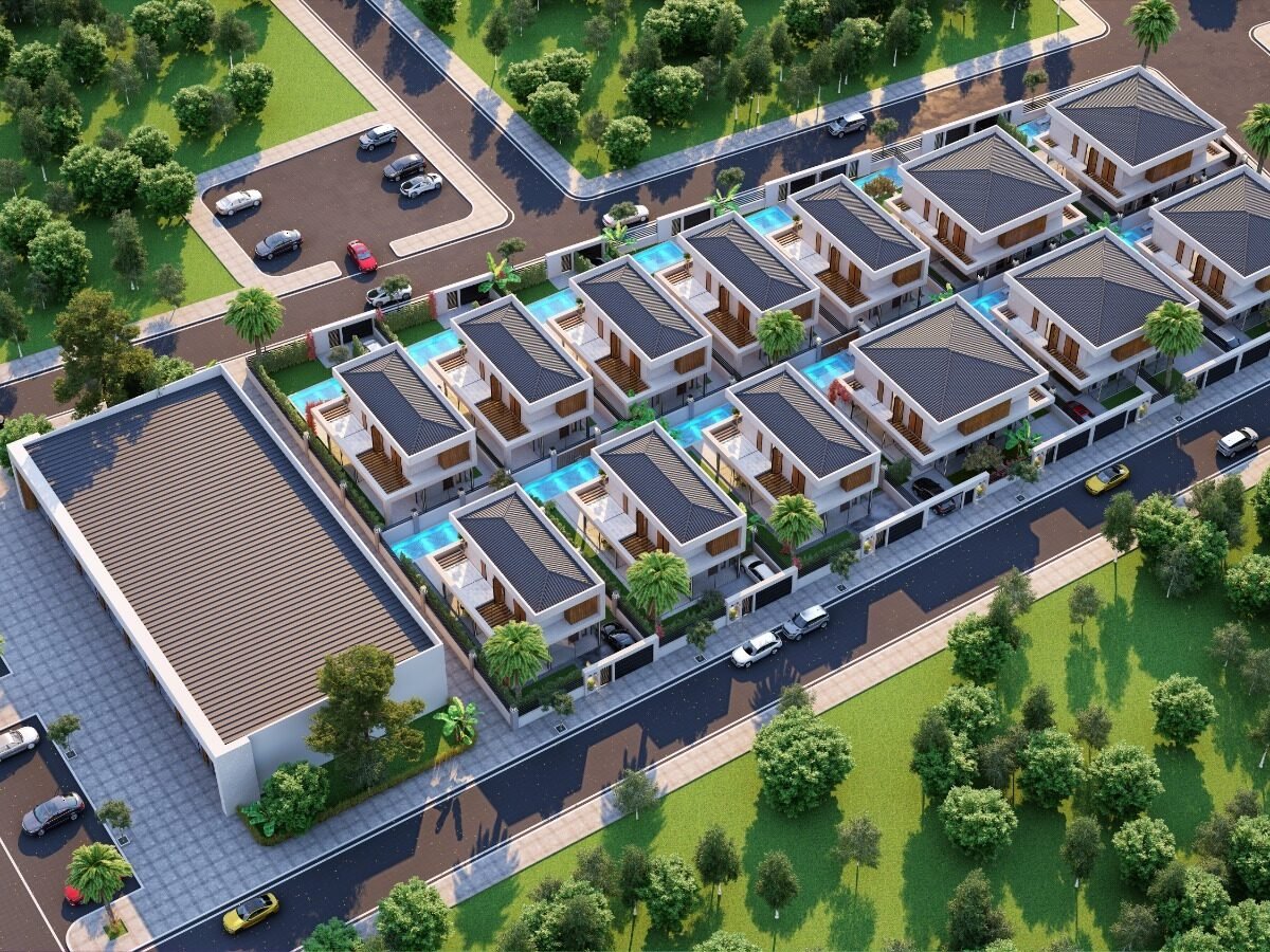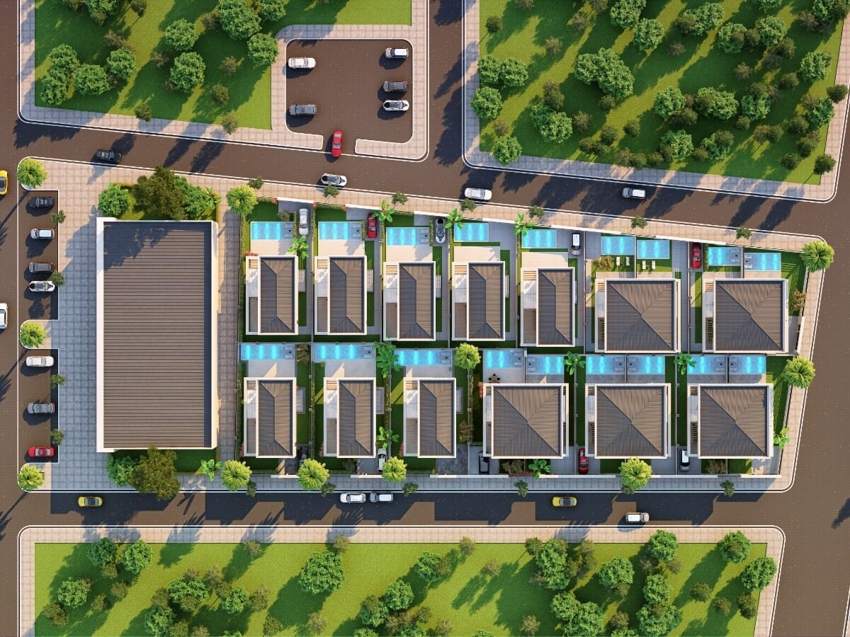 This project has 8 private villas, 10 twin villas, and 8 stores. Each villa has its own garden, parking, and private swimming pool.