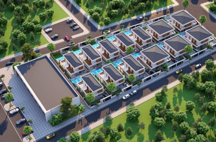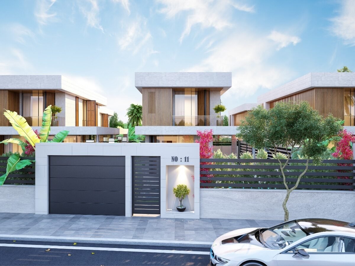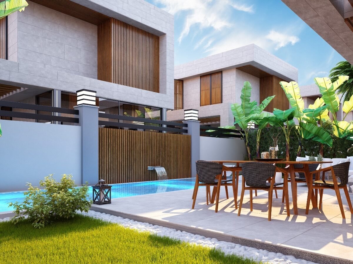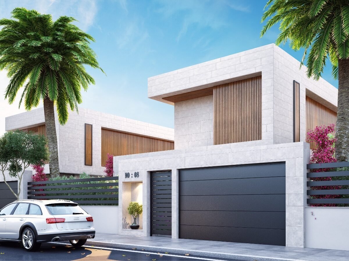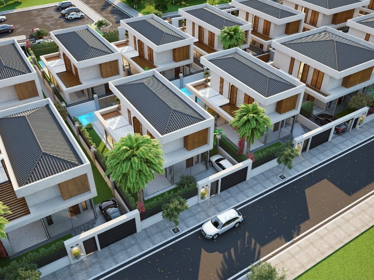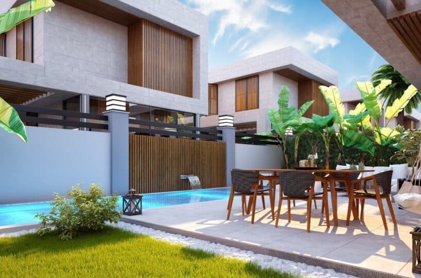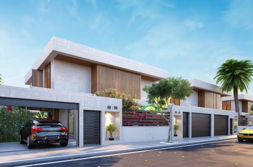 This project has 8 private villas, 10 twin villas, and 8 stores. Each villa has its own garden, parking, and private swimming pool.