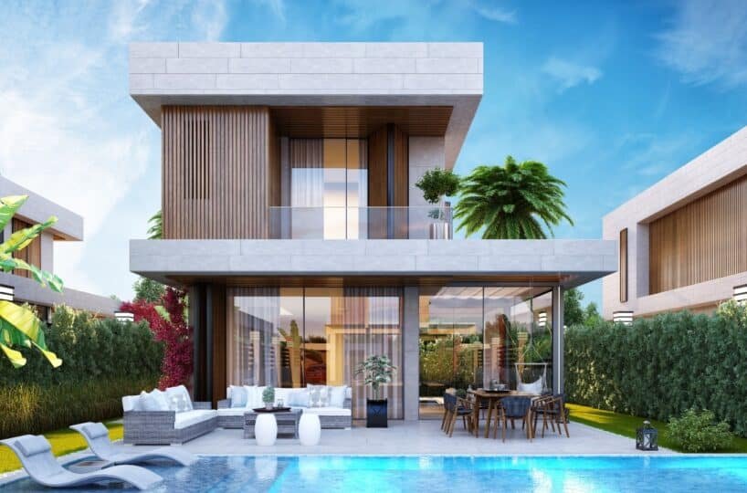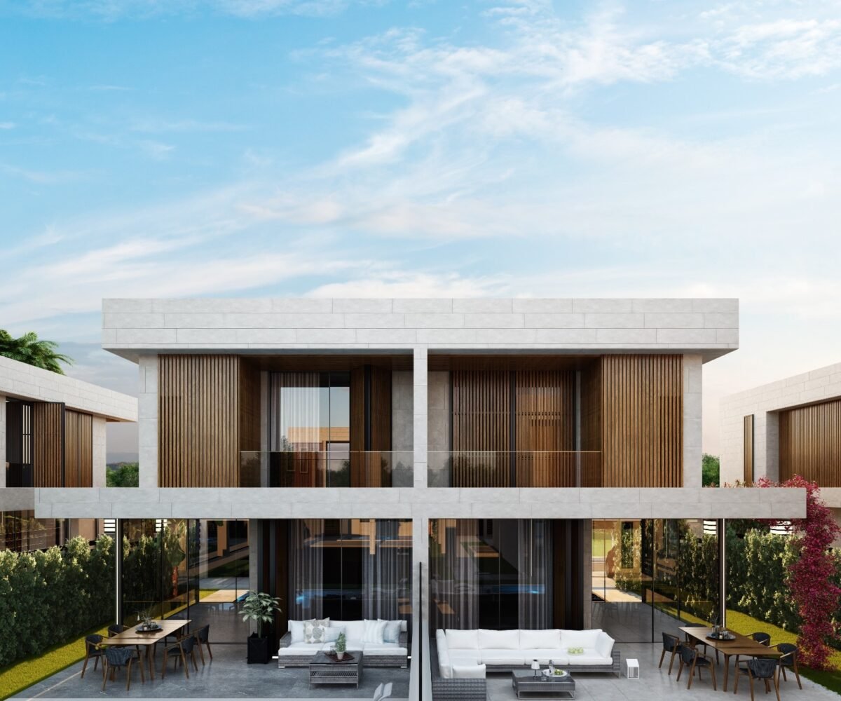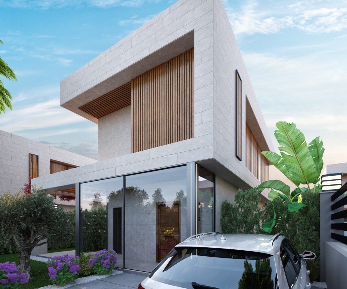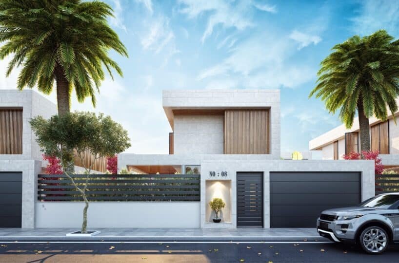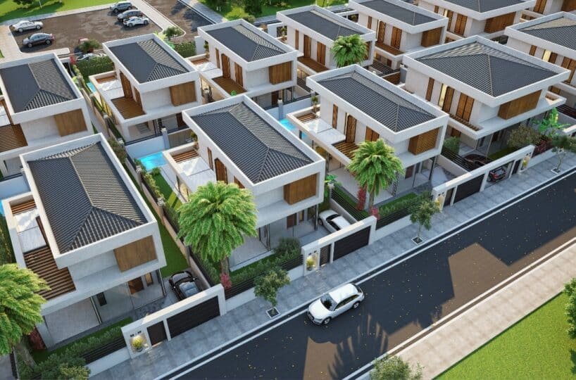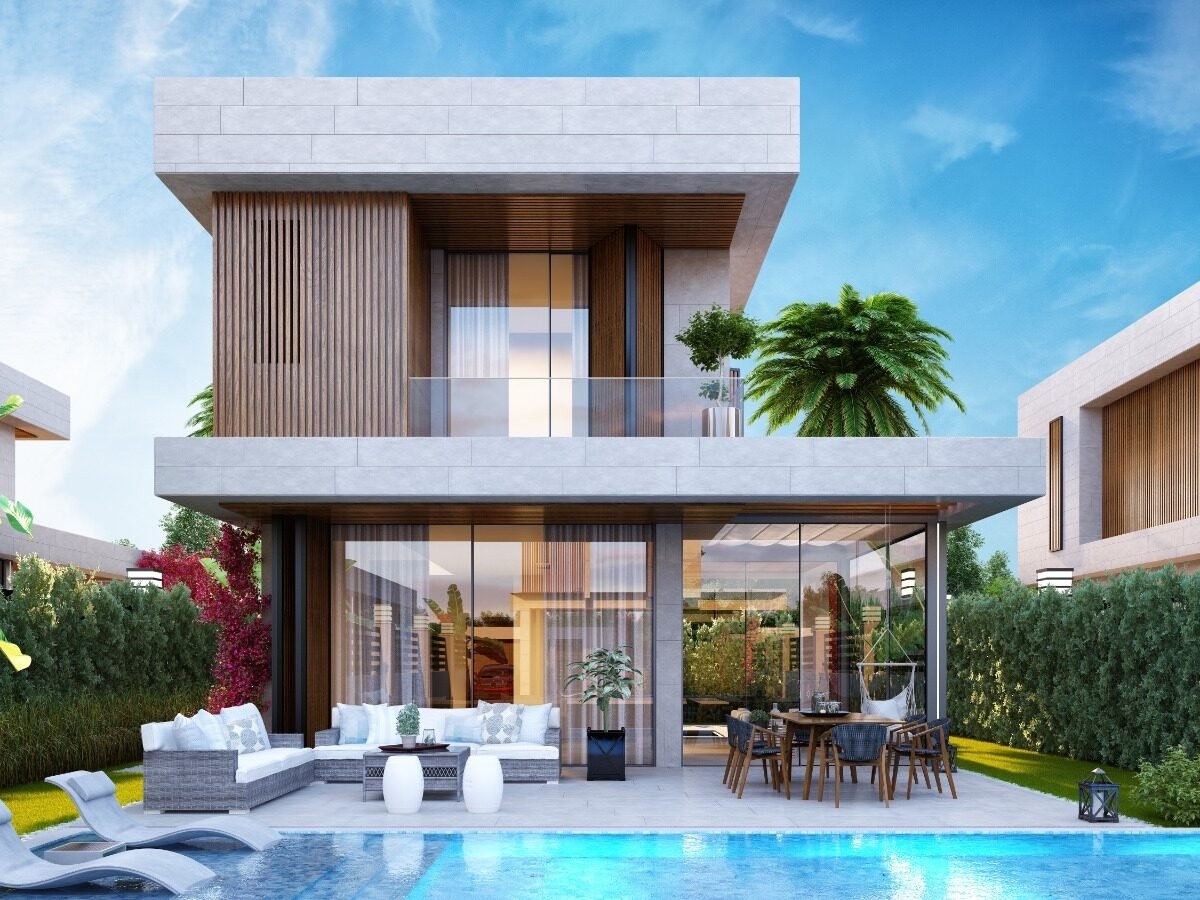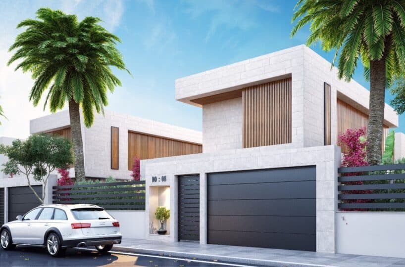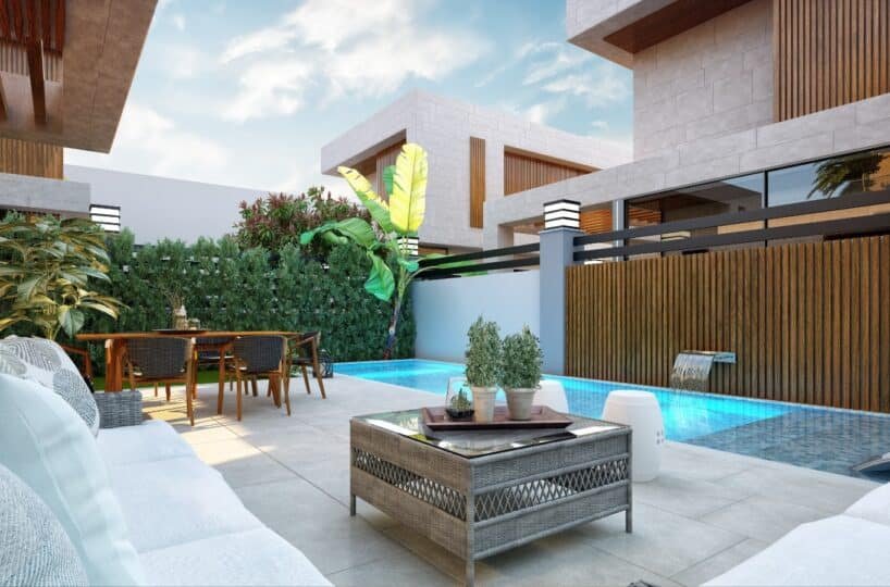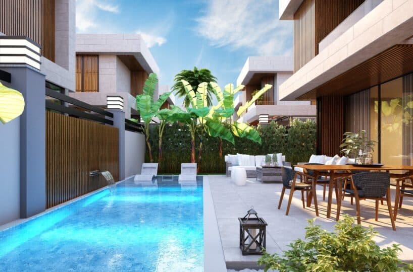 This project has 8 private villas, 10 twin villas, and 8 stores. Each villa has its own garden, parking, and private swimming pool.