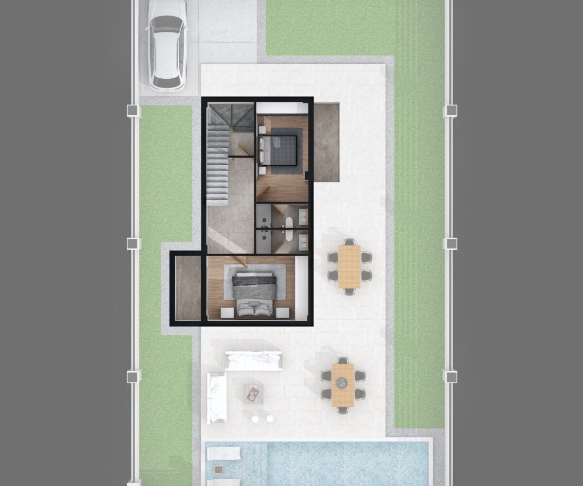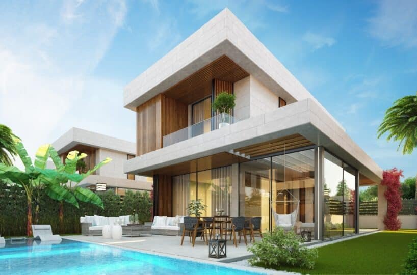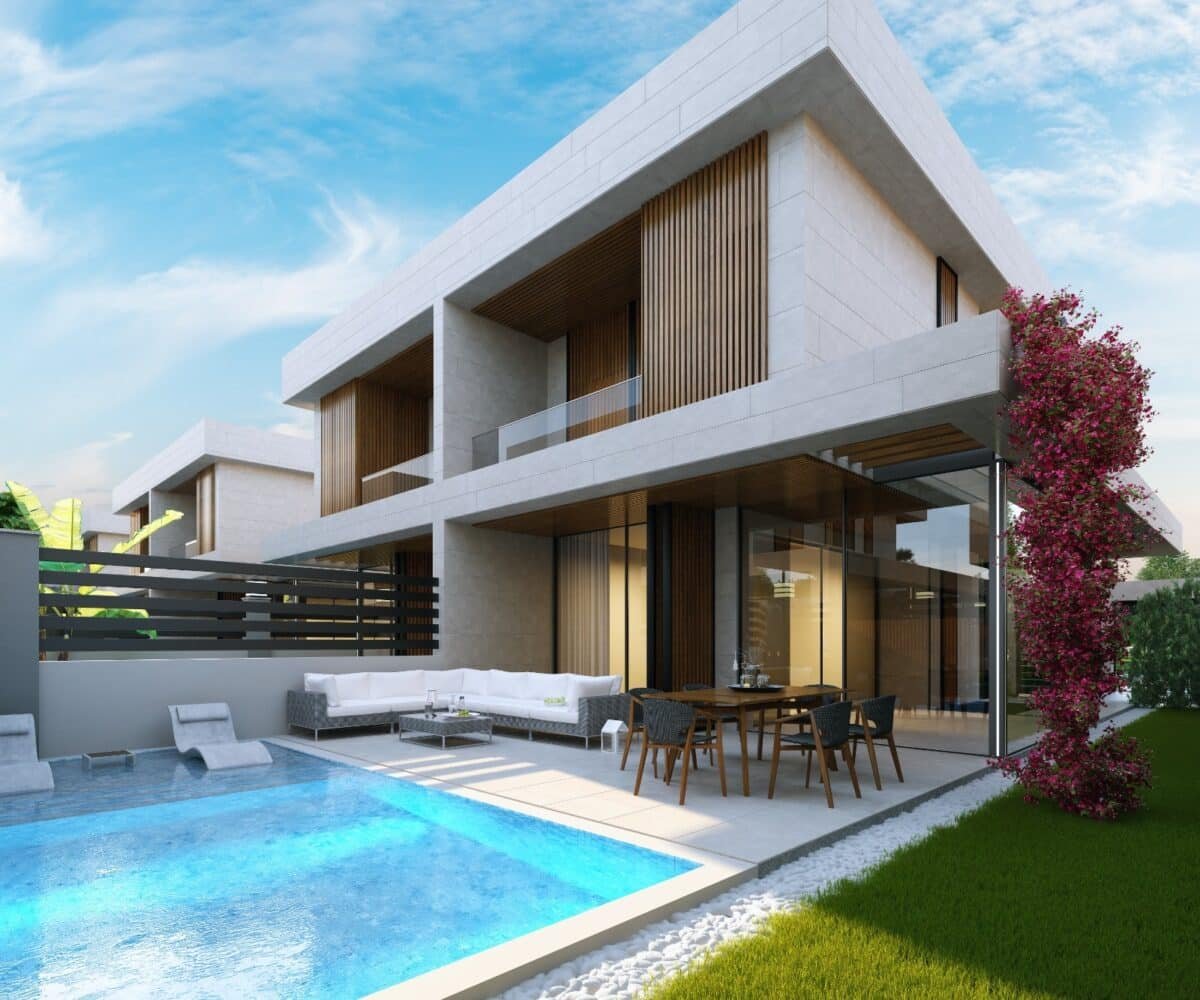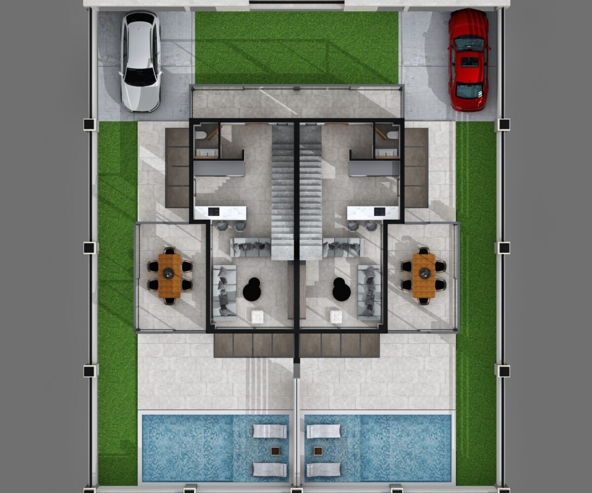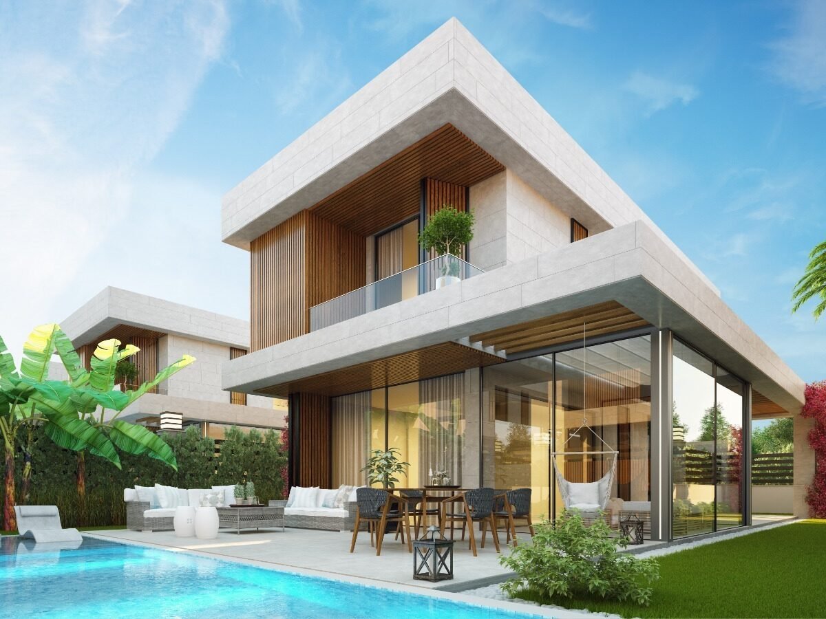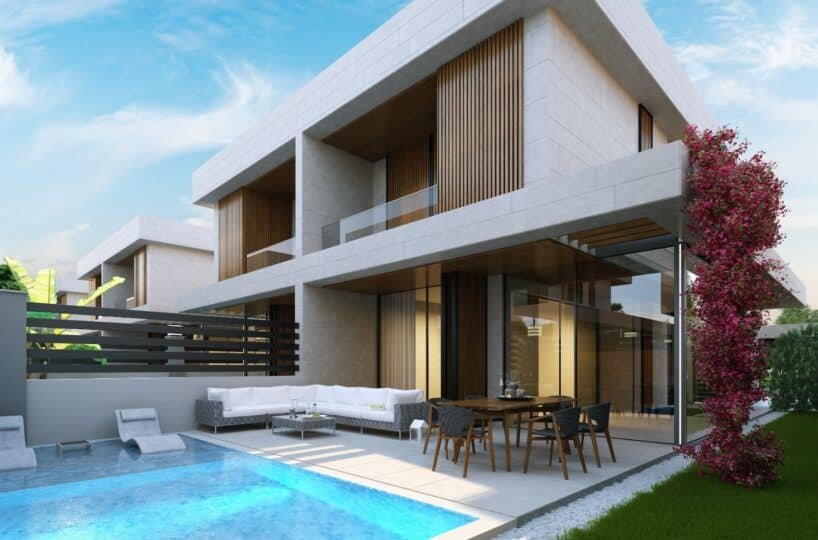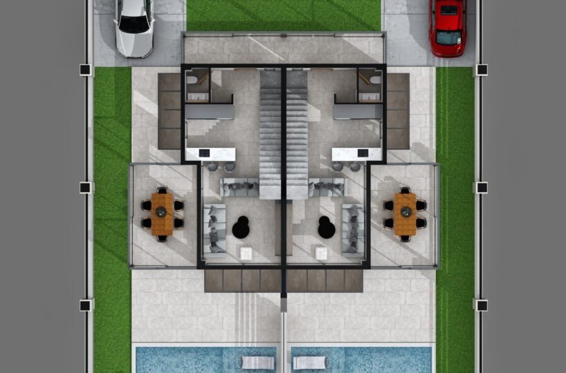 This project has 8 private villas, 10 twin villas, and 8 stores. Each villa has its own garden, parking, and private swimming pool.