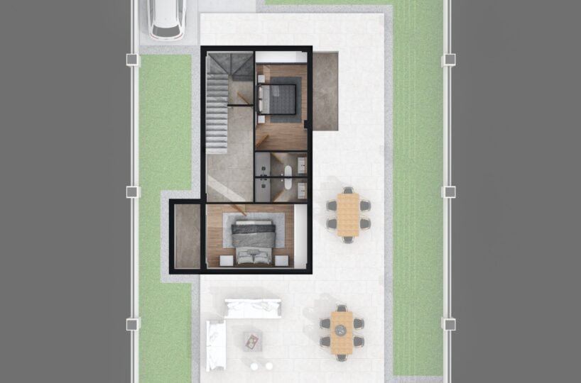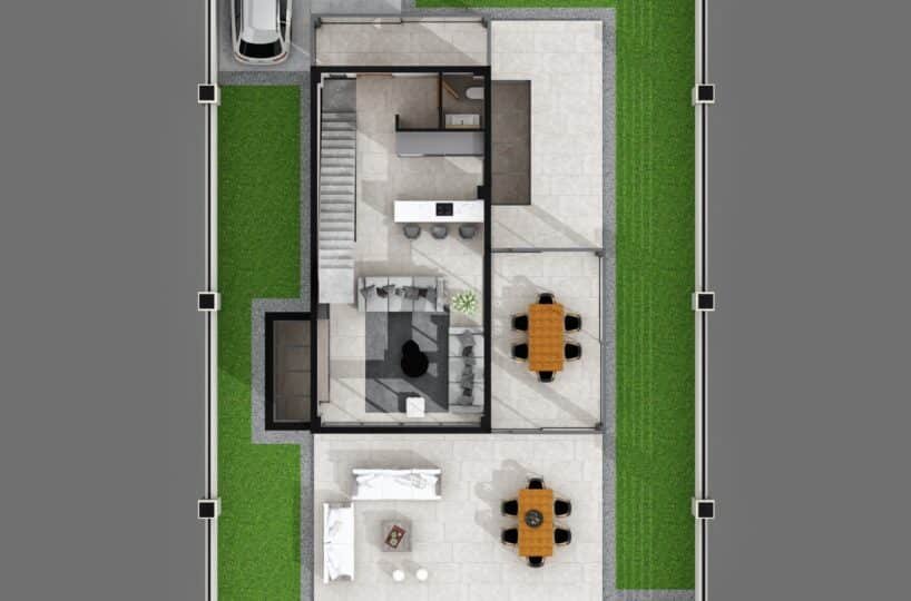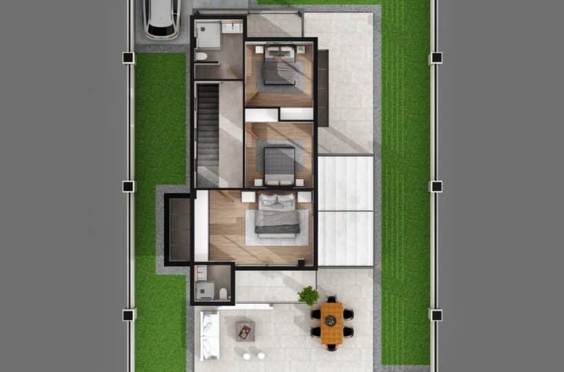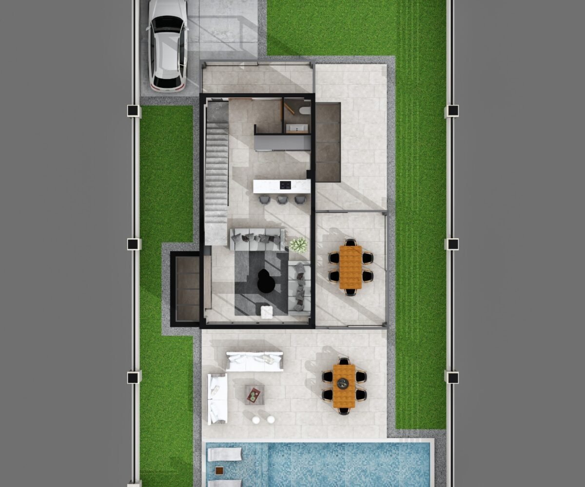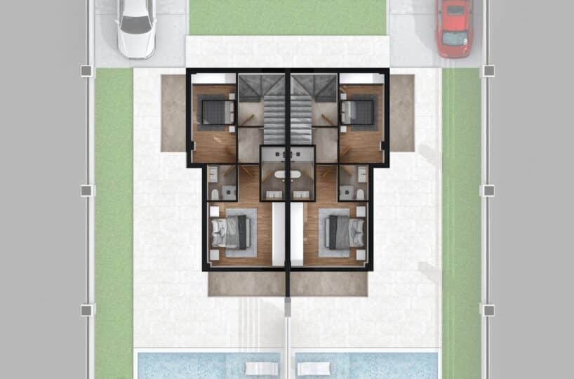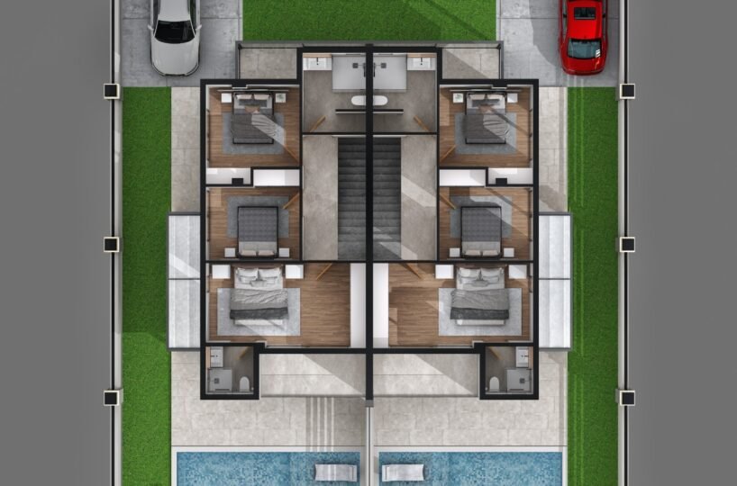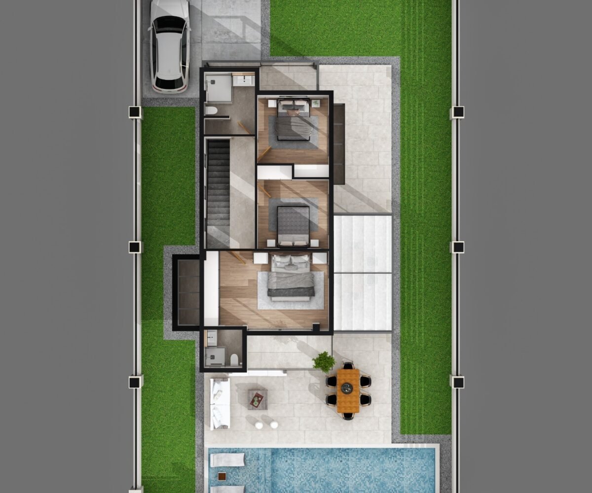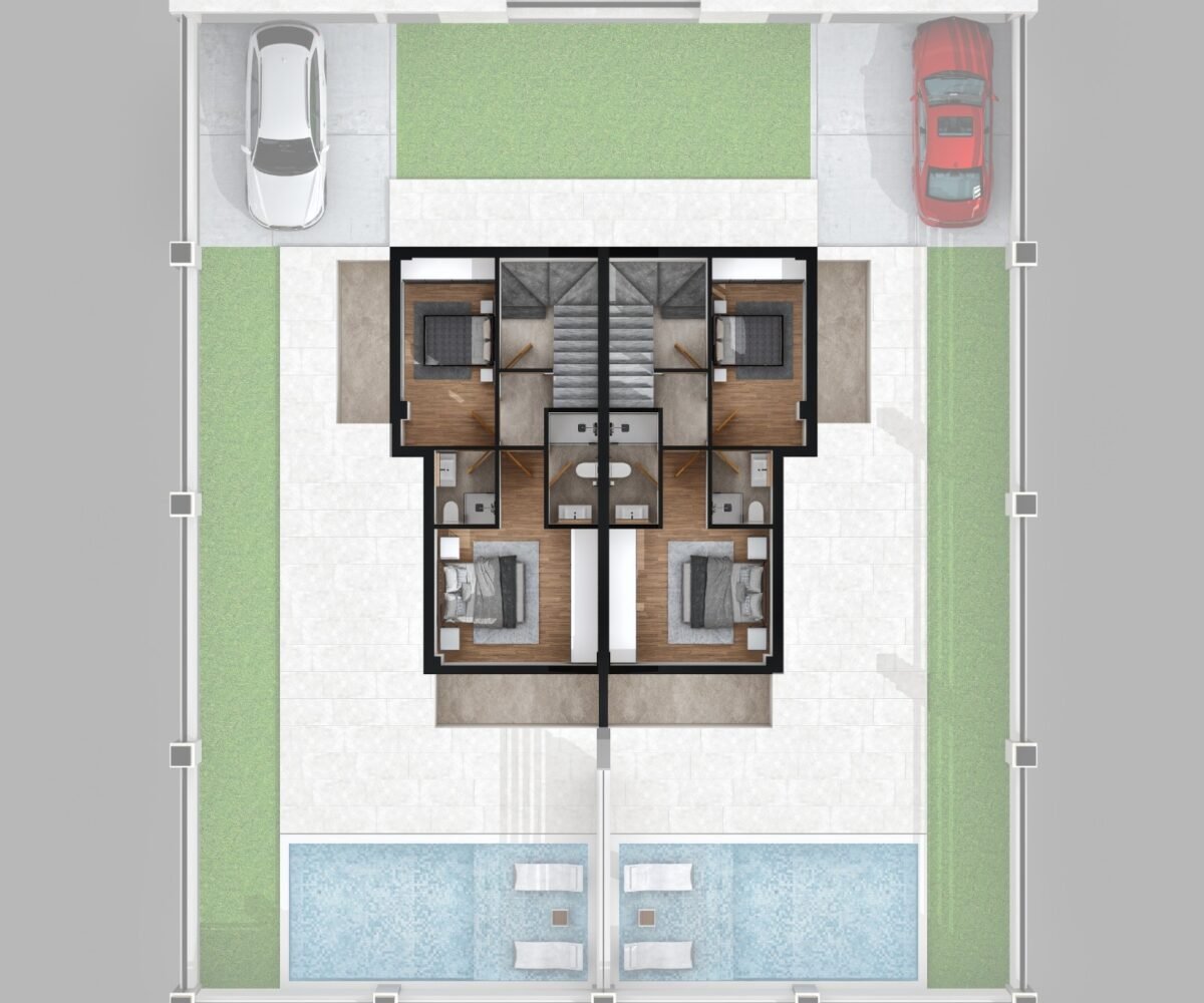 This project has 8 private villas, 10 twin villas, and 8 stores. Each villa has its own garden, parking, and private swimming pool.
