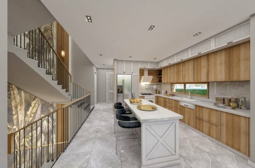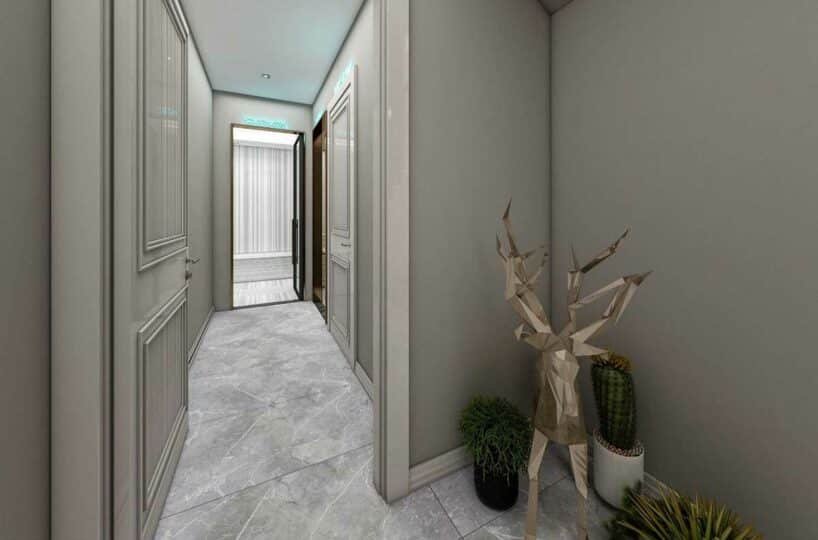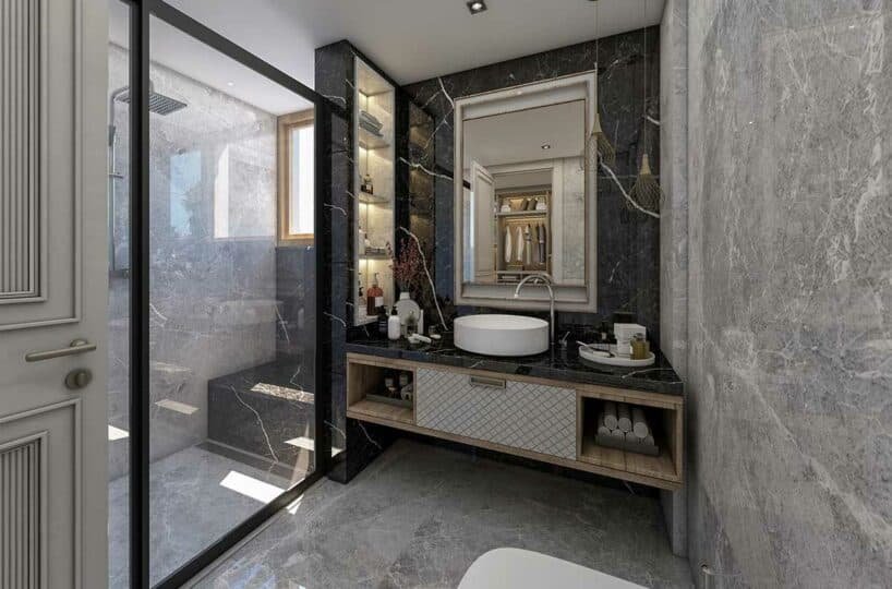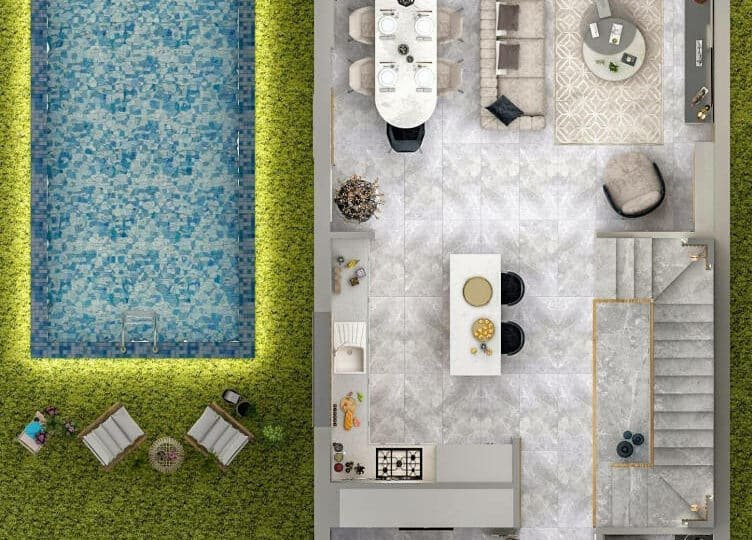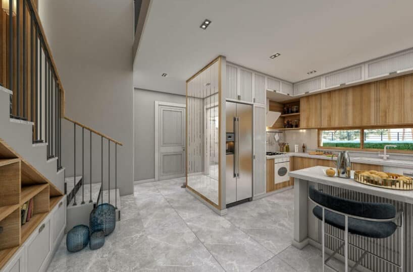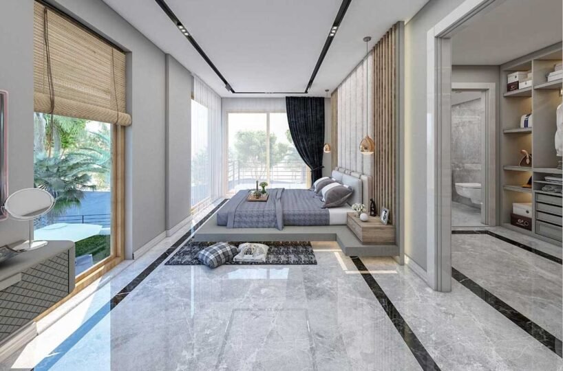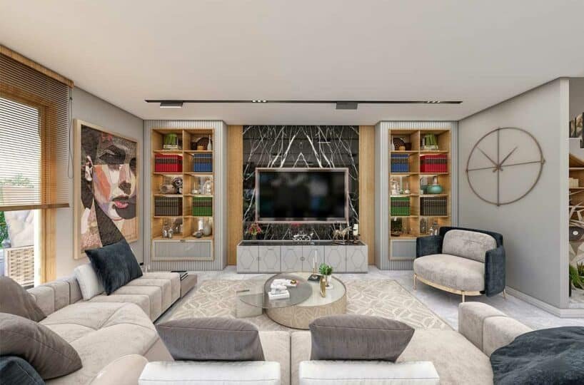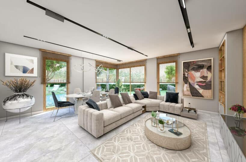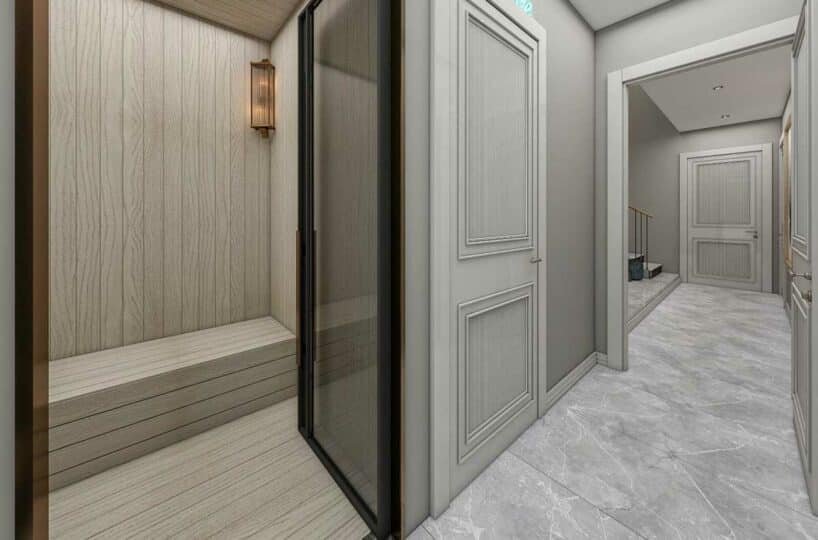 The triplex villas, which are the largest villas of the project, are designed as 6+2. These villas have both 5 bathrooms and special areas such as a jacuzzi, hammam, sauna, and cinema room.
