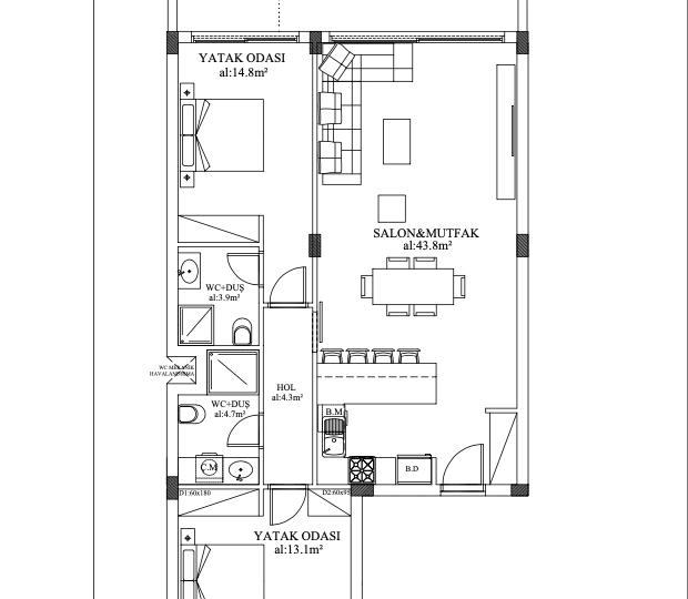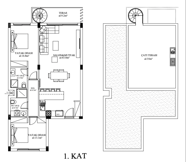 The second type of flat is the elegant 2+1 loft, boasting a sophisticated design and an enchanting roof terrace. Imagine unwinding in your private sanctuary, appreciating views of the surrounding area. The loft flats exemplify modern luxury and present an exquisite living experience where every moment is cherished.
