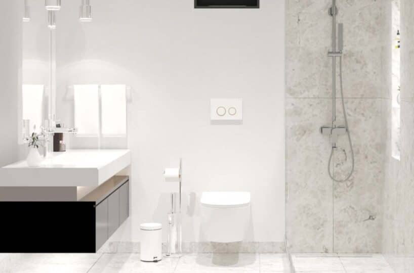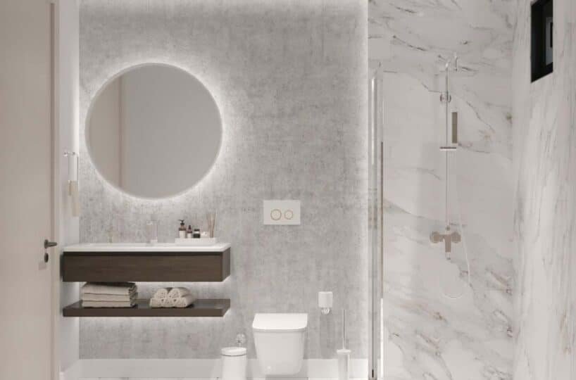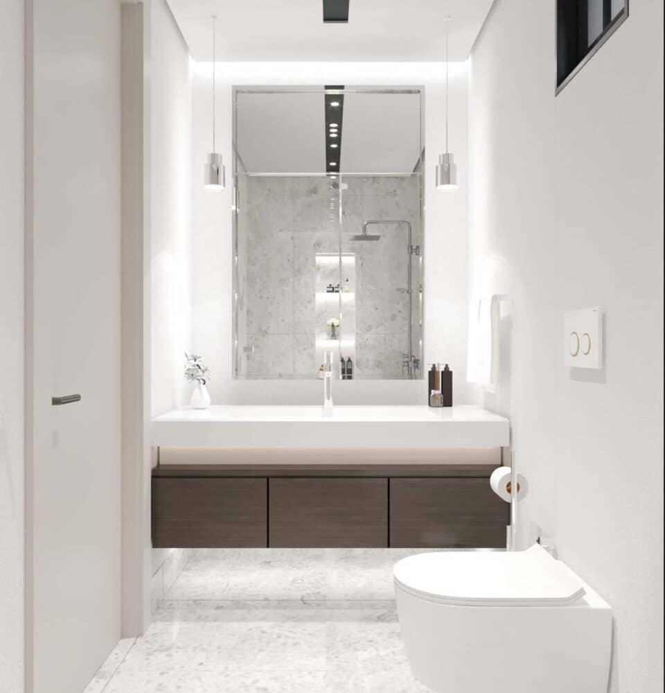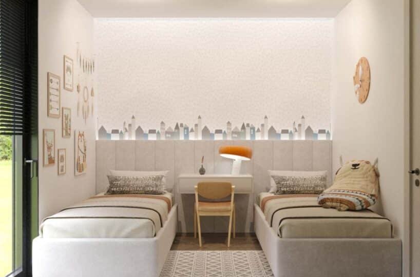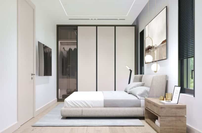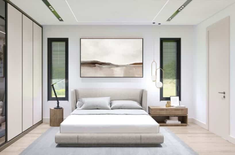 Две спальни будут расположены в задней части и будут доступны из коридора, одна большая главная спальня с двуспальной кроватью, в которой будут высокие узкие окна с видом на природу и собственная современная и полностью выложенная плиткой душевая.