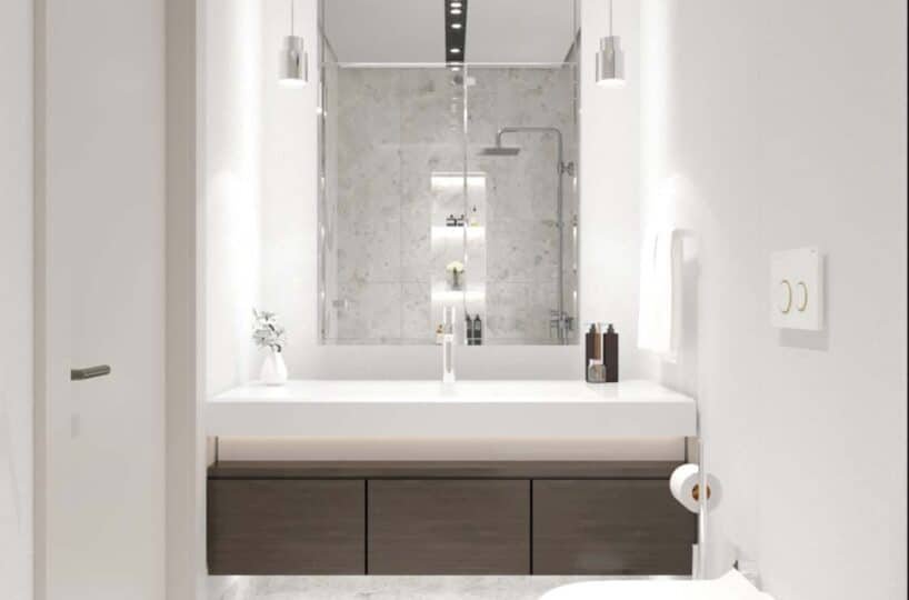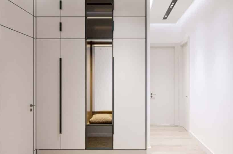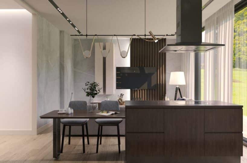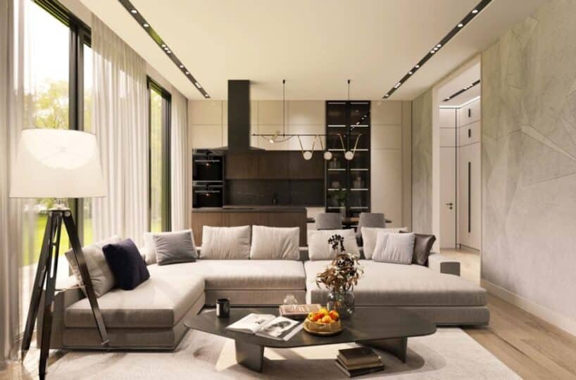 В отдельные одноэтажные дома можно будет попасть с затененной террасы, на которой будет установлена стальная защитная дверь, которая откроется, чтобы попасть в L-образный открытый вестибюль со встроенными шкафами для хранения вещей и прохладным мраморным полом, который ведет прямо в гостиную. гостиная открытой планировки.