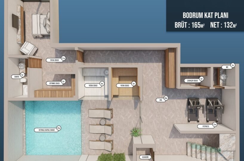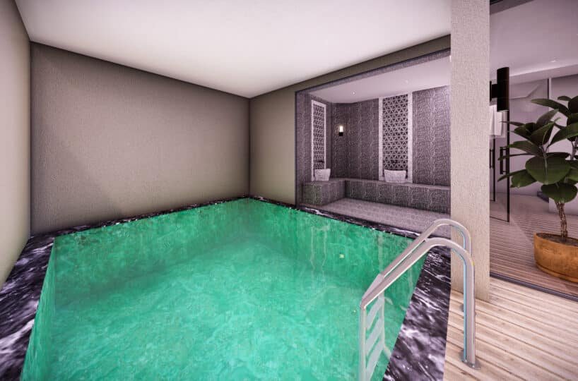 На первом этаже вы также найдете полностью оборудованный фитнес-центр, подогреваемый крытый бассейн, хаммам, сауну и прачечную, обеспечивая удовлетворение всех ваших потребностей. На этом же уровне находятся также спальня-сьют и дополнительная спальня, предоставляющие удобное размещение для гостей.